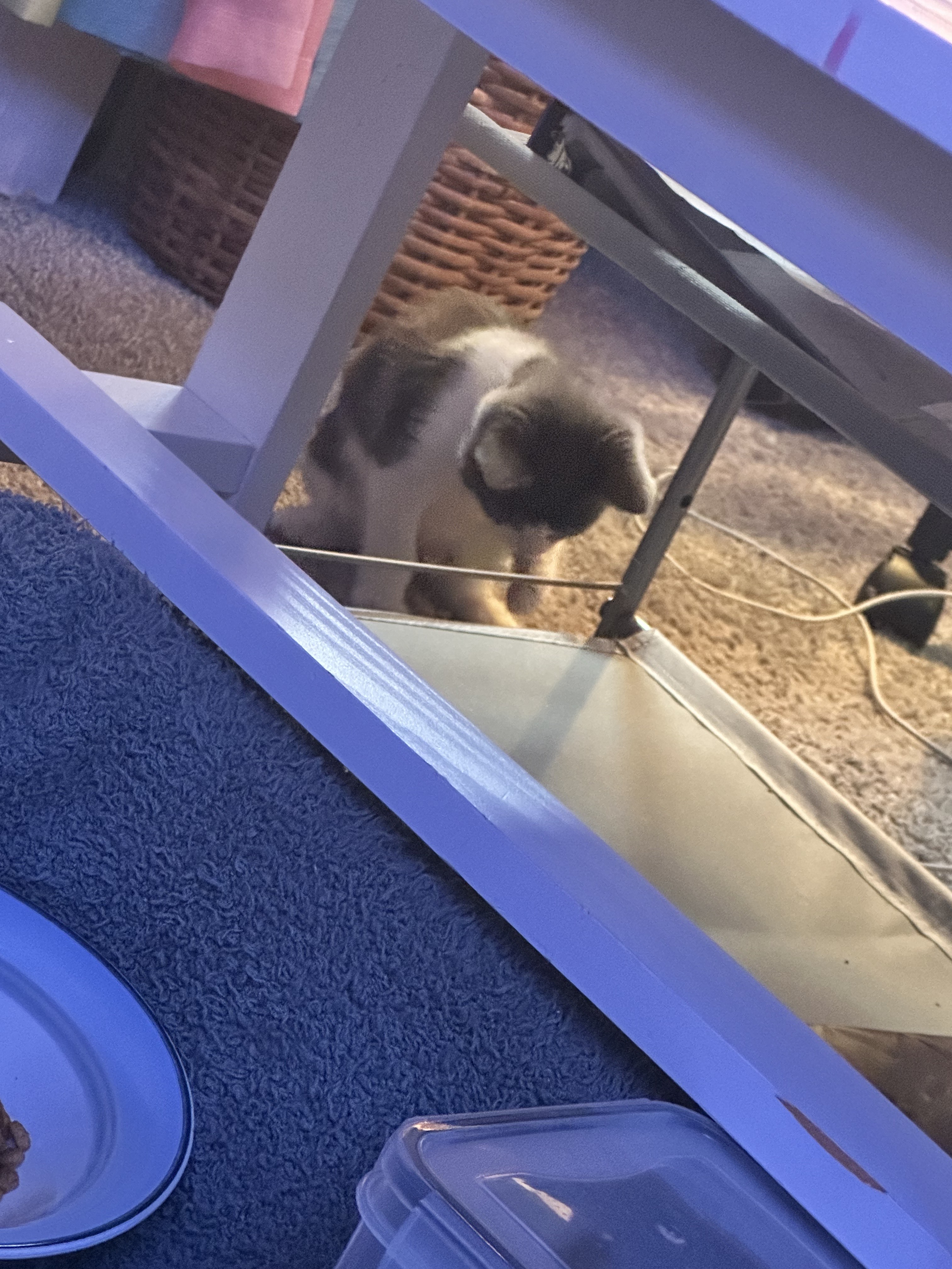 My cousins the week before had introduced me to their newest kitten, a stray named Tallulah Roe. Tallulah spent the few days I was there snuggled up on the couch with me, napping together too. She was a tiny gray kitten, barely as big as my arm. And she was in that pet carrier. They had decided that she had chosen me, napping together and snuggling all the time was a sign. And now, she’s comfortably home with me in my room, with a crib and toys galore.
