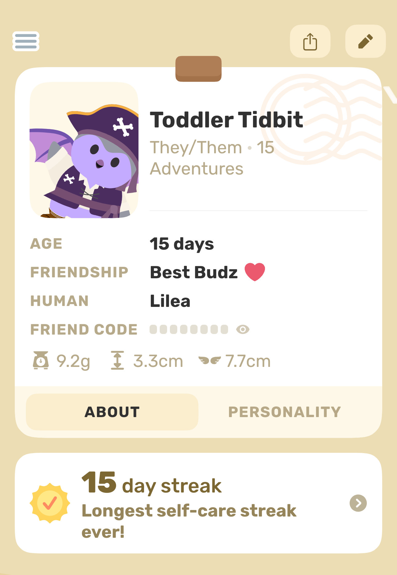 Goal completions and daily challenge completions also earn you gems which are used for customizing your bird and their house. Mine currently has dragon wings, a Pirate outfit, and a pirate themed house. Your friends can send you outfits, come stay over at your place, and send hugs, encouragement, or kind words throughout the day!